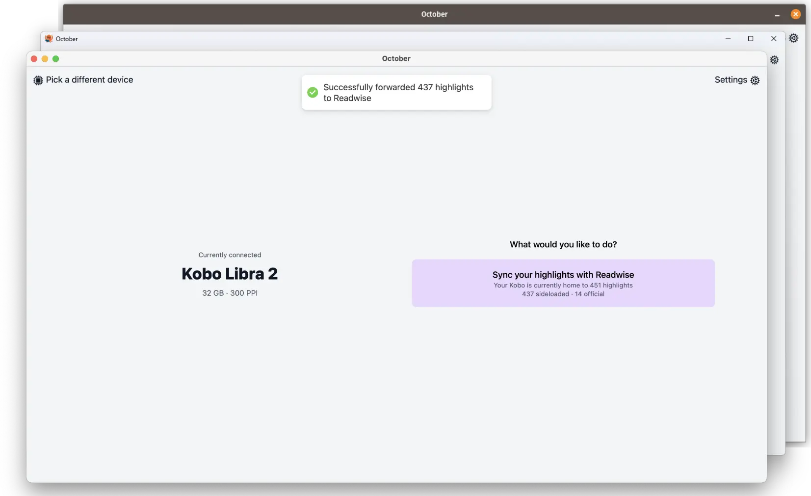October - это небольшая программа Wails, которая позволяет извлечь выделения из Kobo eReaders и затем переслать их в Readwise.
